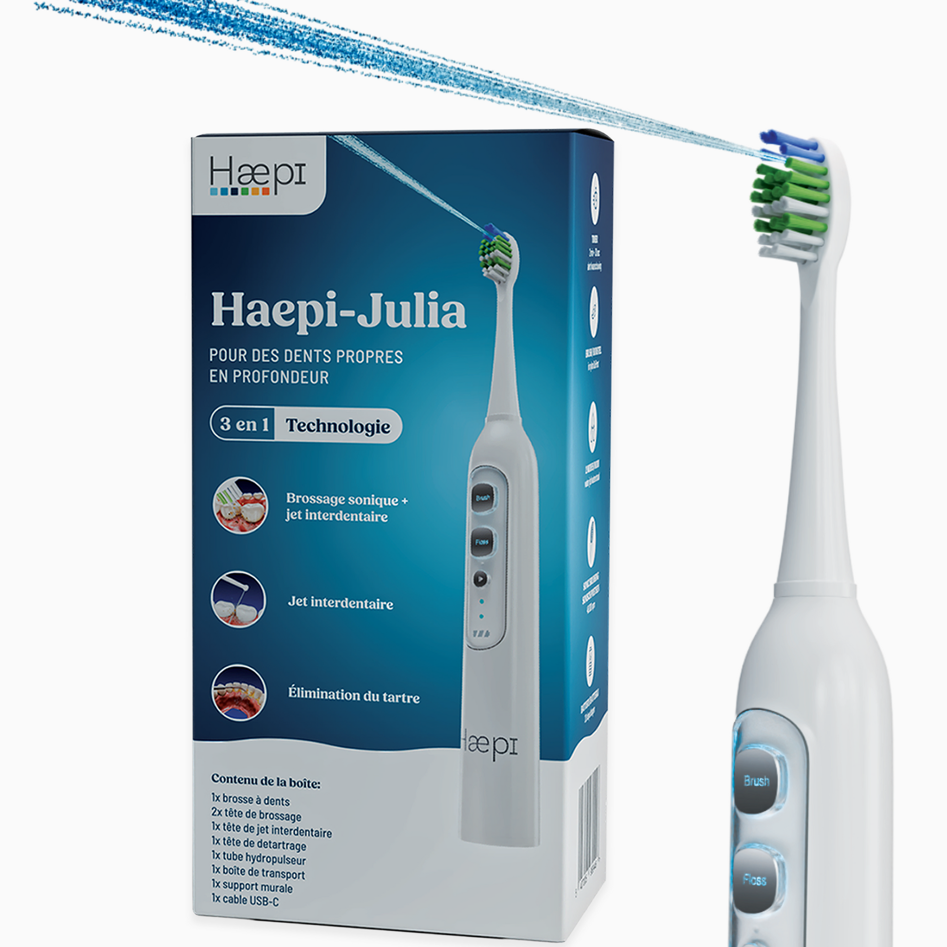 Maar met Haepi Julia heb je geen extra apparaten nodig. Je krijgt een krachtige sonische borstel , een ingebouwde waterstraal en een vibrerende tandsteenverwijderaar – alles in één simpele routine.